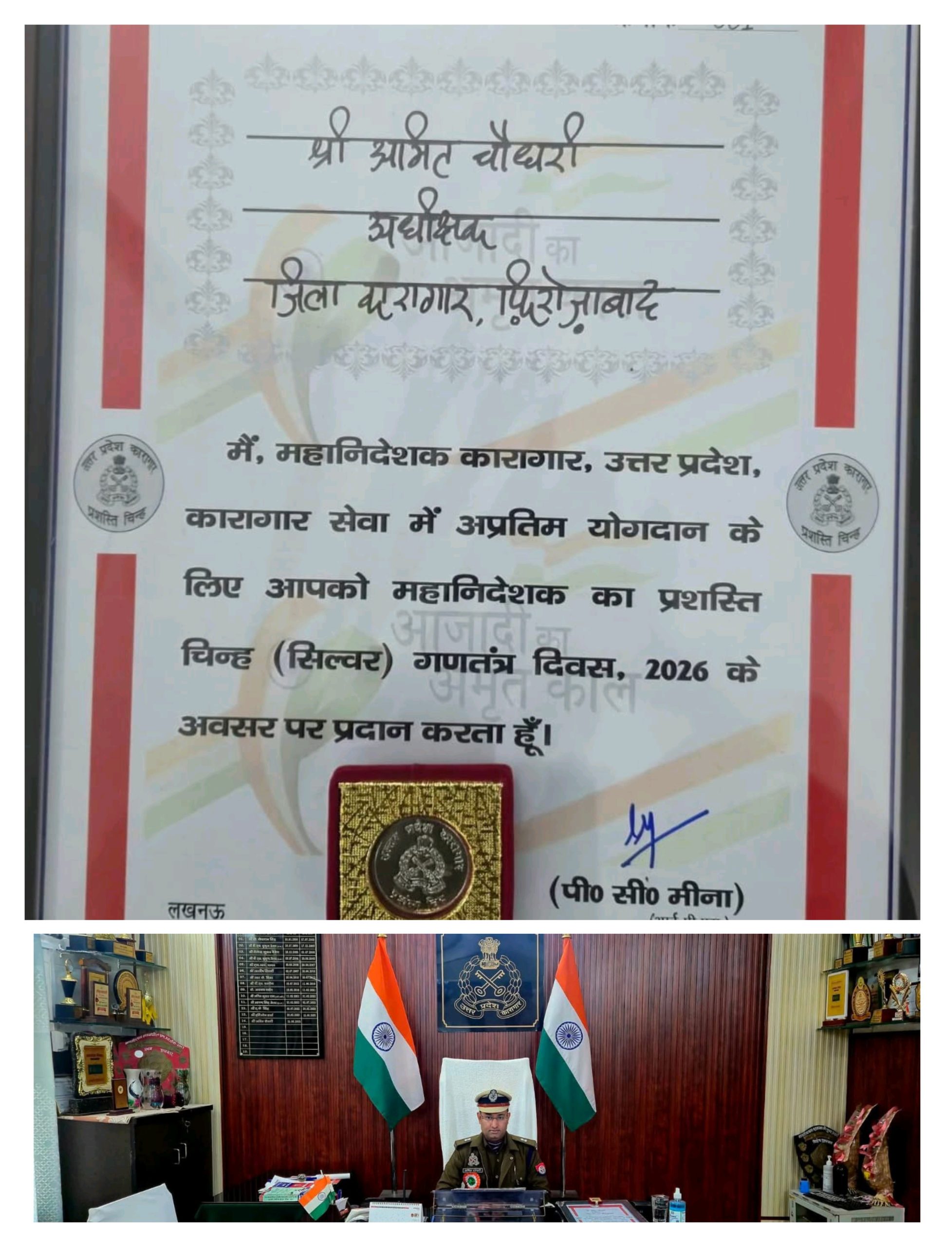 गणतंत्र दिवस के पावन अवसर पर जिला कारागार फिरोजाबाद के अधीक्षक अमित चौधरी को उनके उत्कृष्ट कार्यों के लिए डीजी रजत प्रशस्ति पत्र से सम्मानित किया गया है। यह सम्मान उन्हें कारागार प्रशासन में अनुकरणीय सेवाओं, प्रभावी प्रबंधन और सुधारात्मक पहलों के सफल संचालन के लिए प्रदान किया गया।