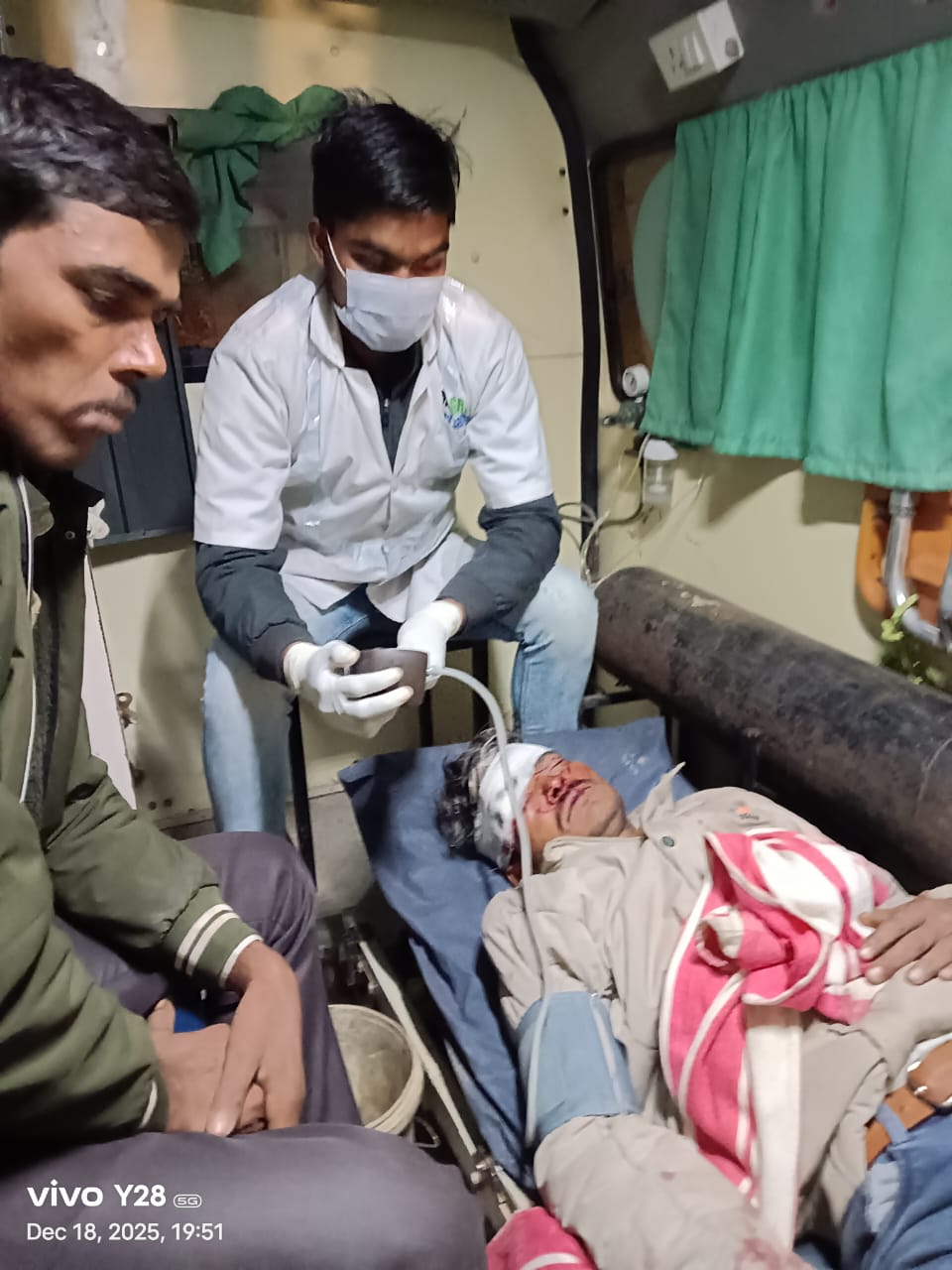 एंबुलेंस में ही घायल की ब्लीडिंग कंट्रोल की गई और वाइटल्स चेक किए गए। विभागीय चिकित्सक डॉ. अमित की सलाह पर प्राथमिक उपचार देने के बाद घायल को सामुदायिक स्वास्थ्य केंद्र सिरसागंज में भर्ती कराया गया।