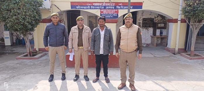 अपर पुलिस अधीक्षक ग्रामीण फिरोजाबाद के पर्यवेक्षण और क्षेत्राधिकारी सिरसागंज के नेतृत्व में थाना प्रभारी सिरसागंज पुलिस बल तथा एसओजी टीम ने संयुक्त कार्रवाई करते हुए दिनांक 02 फरवरी 2026 को एनएच-19 नगला राधे मोड़ अंडरपास के पास से अभियुक्त को दबोच लिया। अभियुक्त के विरुद्ध मु0अ0सं0-03/26 धारा 2/3 गैंगस्टर एक्ट के तहत मामला दर्ज है।